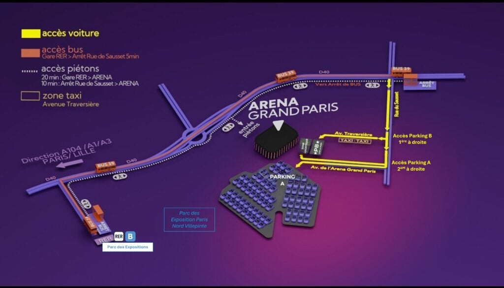 Depuis la gare RER Parc des Expositions, prendre le bus 39 direction « Gare du Vert Galant » et s’arrêter à l’arrêt « Rue du Sausset » (1er arrêt). Suivre ensuite le chemin piéton vers l’Arena Grand Paris .